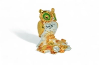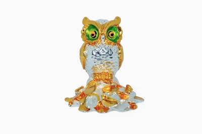 Golden Owl Figurine with Silver Feathers and Green-Yellow Eyes – Handcrafted Decorative Sculpture